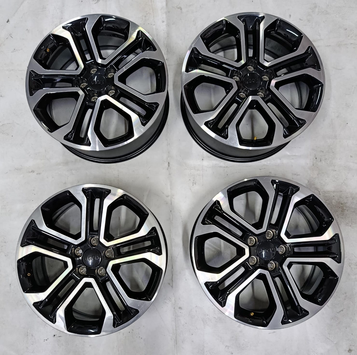 Juego completo de 4 llantas Originales de segunda mano de Jeep Compass Limited 4XE SPORT 13 GSE T4 negras diamantadas de 18 pulgadas 5 Tornillos de segunda mano Tornillería 5×110 llantas de Jeep Compass II están en perfecto estado ver fotografías.